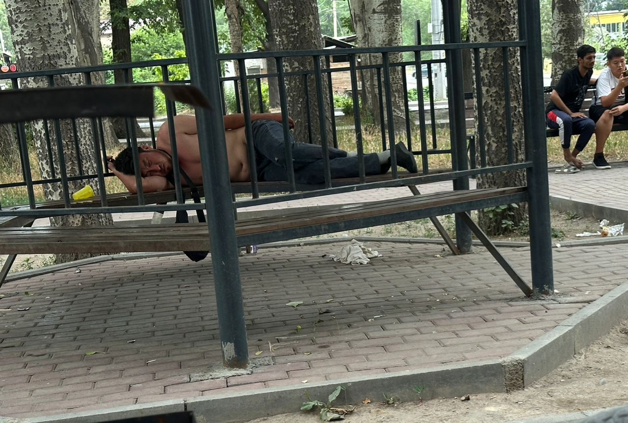В Бишкеке вчера вечером пьяный мужчина без верхней одежды спал на детской площадке на улице Ак-Тилек. Об этом сообщил читатель 24-kg.com.