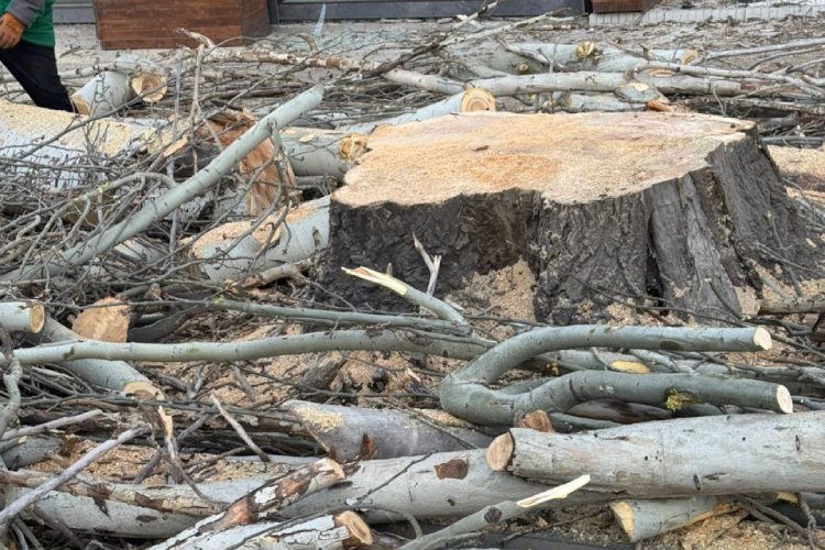 В Бишкеке возле кафе Lale Doner на пересечении улиц Ахунбаева и Шукурова без разрешительных документов спилили тополь. Об этом 24-kg.com сообщили жители близлежащих домов.