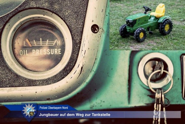 Как отмечается, полиция города Ингольштадт увидела необычное зрелище на сельской дороге — маленький мальчик ехал вдоль обочины на игрушечном тракторе. Удивленные полицейские остановились и поинтересовались у юного тракториста, куда он направляется. На что мальчик незамедлительно ответил: «На заправку. Топливо