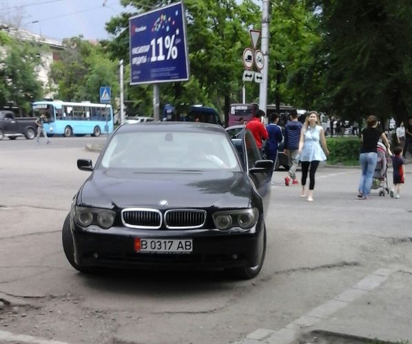 По ее данным, вчера, 25 мая, на пересечении улицы Айни и проспекта Мира в 19.02 водитель черной автомашины седьмой серии BMW, с госномером B0317AB припарковался на пешеходном переходе, перегородив проход пешеходам.