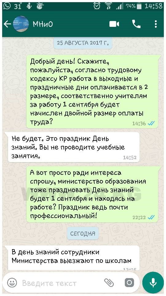 Напомним, вопросы и отзывы о работе отделов образования, детских садов, школ и вузов, выявленных нарушениях, а также о проводимых реформах можно направлять в Минобразования по номеру WhatsApp 0(700) 744-748.