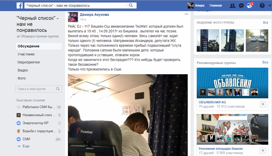 Вчера рейс DJ- 117 Бишкек — Ош авиакомпании ТezJet, который должен был вылетать в 19.45 из Бишкека, вылетел на час позже. Возможно, из-за депутата Искандера Матраимова, считает пользователь социальной сети Facebook Дамира Акунова.