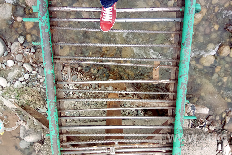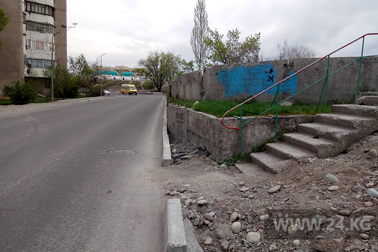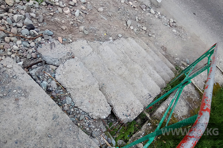 «По этому мостику страшно переходить через речку: подняться и спуститься сможет далеко не каждый человек. С одной стороны ступени выводят на проезжую часть улицы Малдыбаева, по которой всегда движется много машин», — написала она.