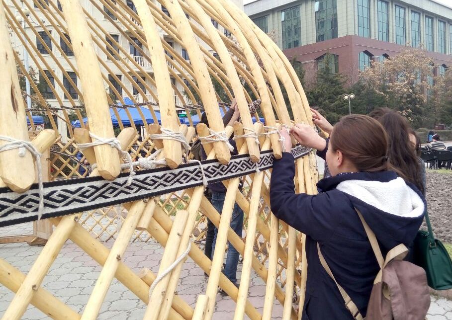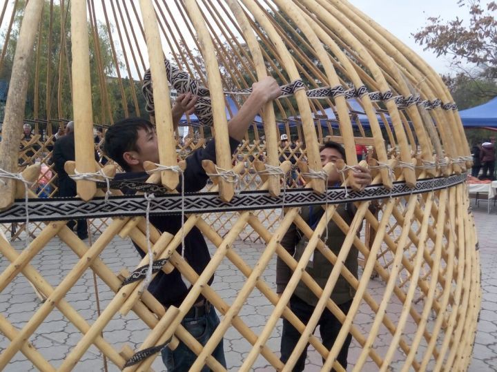 Гостям демонстрируют, как устанавливать юрту, какие особенности проживания в ней.