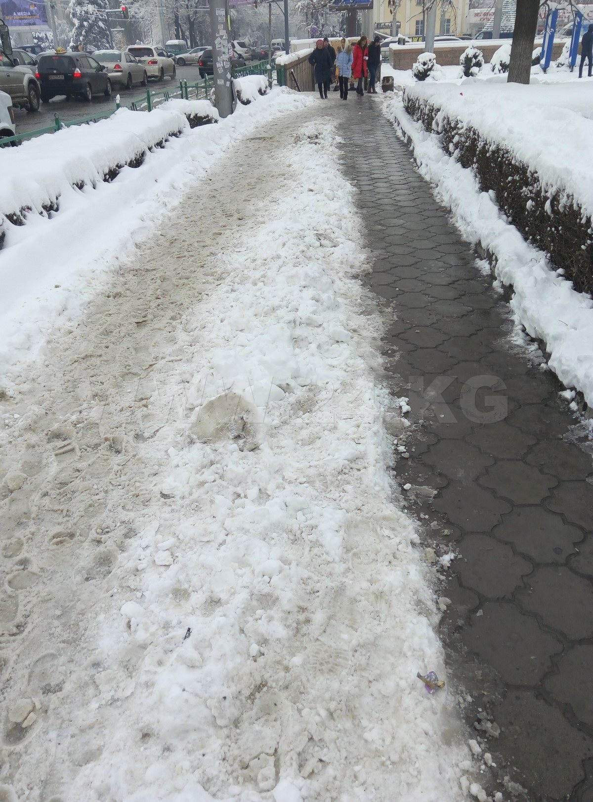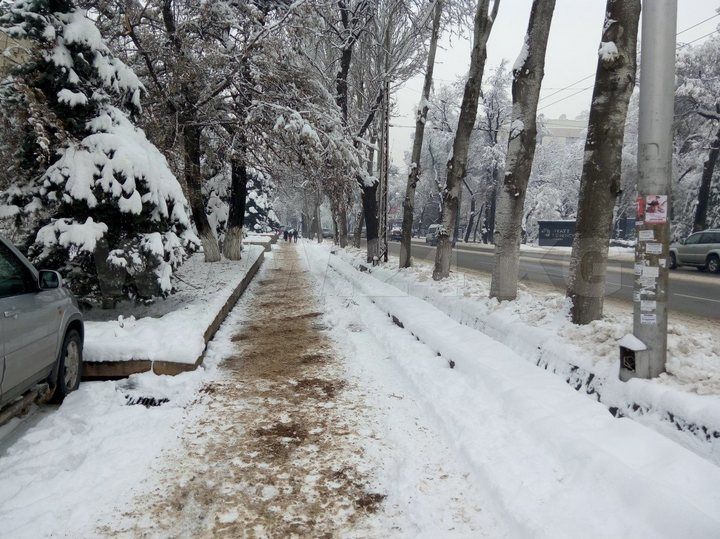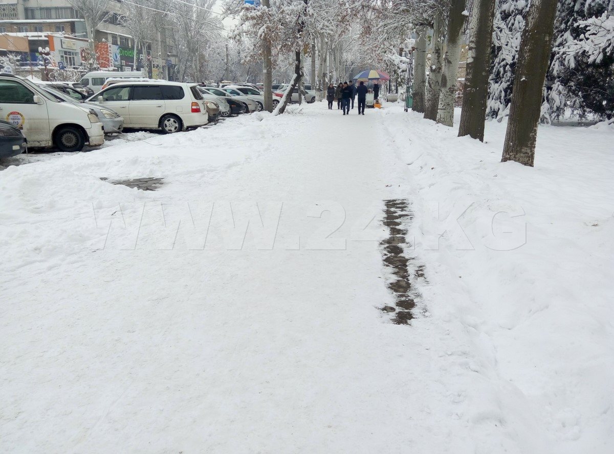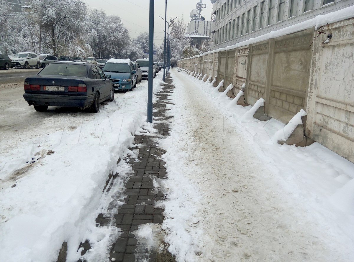 Снег на тротуарах на Шопокова, между Фрунзе и Чуй, хорошо утоптан