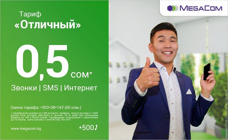 Компания MegaCom объявляет о запуске нового тарифа «Отличный». От множества других он отличается простотой, отсутствием абонентской платы и единой выгодной ценой за внутрисетевые звонки, SMS и мегабайты – всего 0,5 сома.