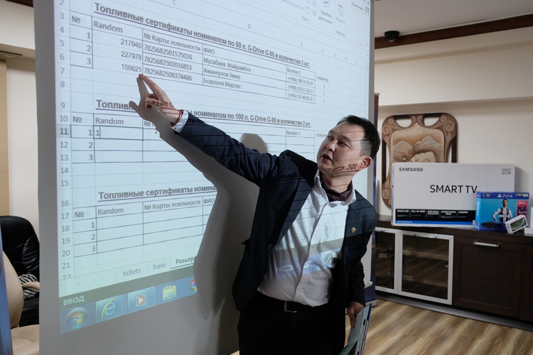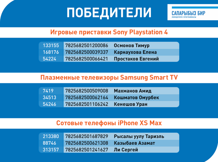 В акции приняли участие более 64 тысяч держателей карт лояльности «Сапарыбыз бир», накопивших более 323 тысяч виртуальных билетов. Розыгрыш проводился в режиме онлайн с использованием сайта Random.org в присутствии коллегии независимых наблюдателей.
