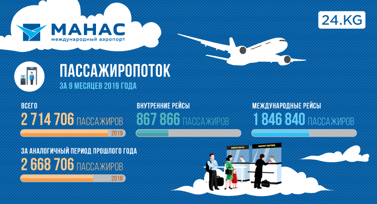 За девять месяцев 2019-го ОАО «Международный аэропорт «Манас» обслужило 2 миллиона 714 тысяч 706 пассажиров, что на 46 тысяч больше, чем за аналогичный период прошлого года. Из них на внутренних авиалиниях пассажиропоток составил 867 тысяч 866 человек, на международных — 1 миллион 846 тысяч 840.
