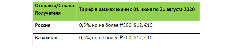 Теперь отправка денег родным и близким в Россию и Казахстан стала еще доступнее с новыми тарифами в рамках акции: 0,5 процента от суммы перевода, но не более 500 рублей, 12 долларов США или 10 евро в зависимости от валюты перевода.