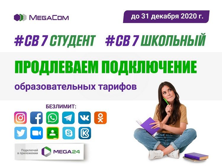 Компания MegaCom продлевает подключение к образовательным льготным тарифам #СВ 7 Школьный и #СВ 7 Студент для учеников средних образовательных учреждений и студентов вузов до 31 декабря 2020 года (включительно).