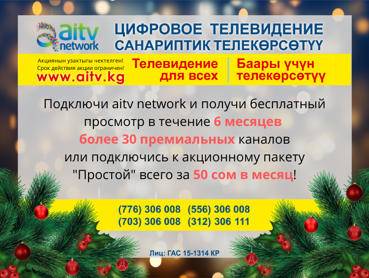 - Подключиться к пакету «Простой», а это более 40 интересных и разнообразных каналов на любой вкус. Всего за 50 сомов в месяц вы можете наслаждаться просмотром рейтинговых кыргызских и зарубежных телеканалов круглосуточно и без перебоев.