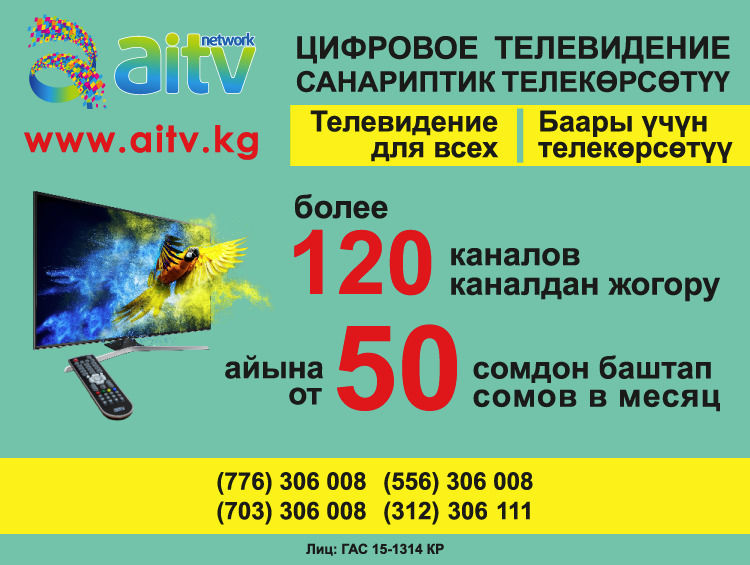 Подключи телевидение с ежемесячной оплатой всего 50 сомов и наслаждайся просмотром рейтинговых кыргызских и зарубежных телеканалов, круглосуточно и без перебоев.