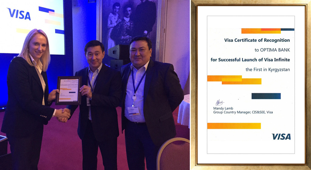 Международная платежная система Visa International наградила ОАО «Оптима Банк» почетным сертификатом за успешный запуск привилегированной карты Visa Infinite первым в КР в знак признания вклада банка в развитие данного сегмента в Кыргызстане.