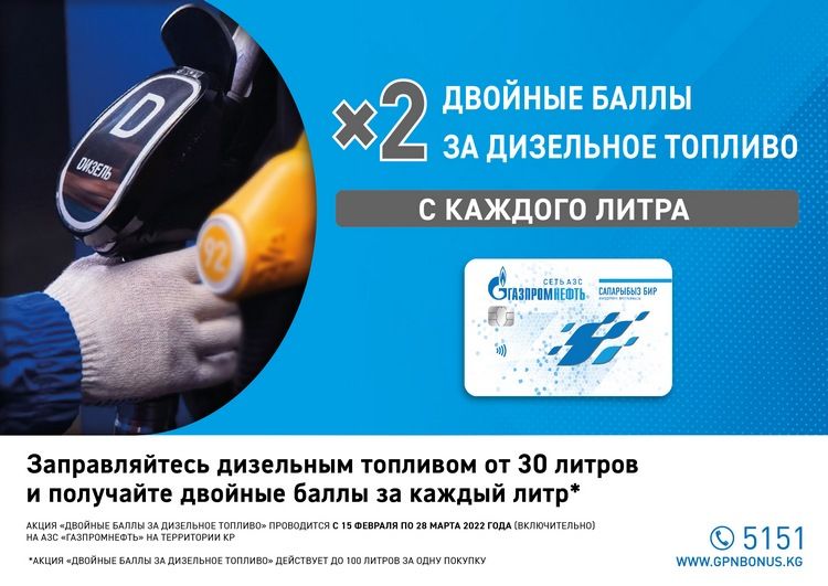 С 15 февраля на АЗС «Газпромнефть» стартовала акция «Двойные баллы за дизельное топливо». Заправляйтесь от 30 литров* дизельным топливом с картой лояльности «Сапарыбыз бир» и получайте в два раза больше баллов. Акция продлится до 28 марта включительно.