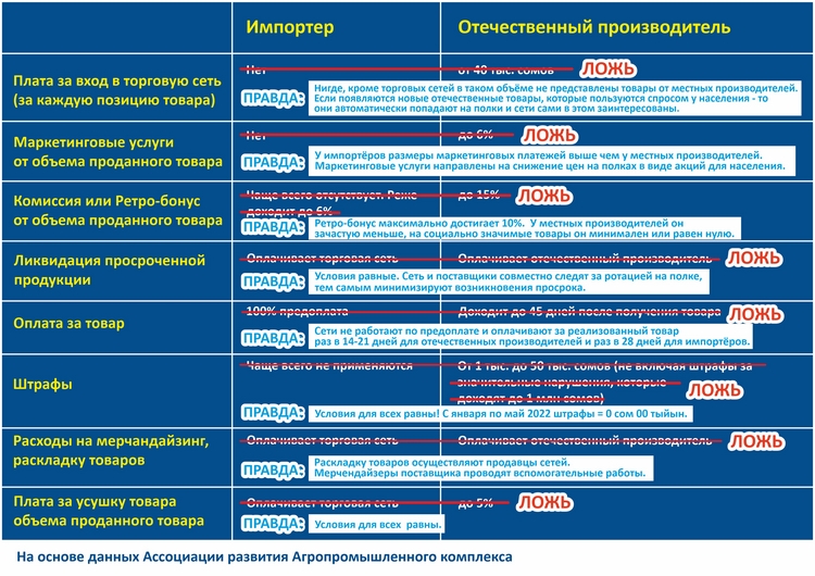 Первый — якобы торговые сети создают более выгодные условия для поставщиков импортной продукции. А вот местный бизнес «душат» дополнительными выплатами. В итоге отечественный товар становится менее конкурентоспособным и дорогим. Но на самом деле ситуация выглядит иначе. Условия для предпринимателей, которые поставляют товары из-за границы, гораздо жестче, чем у местного производителя.