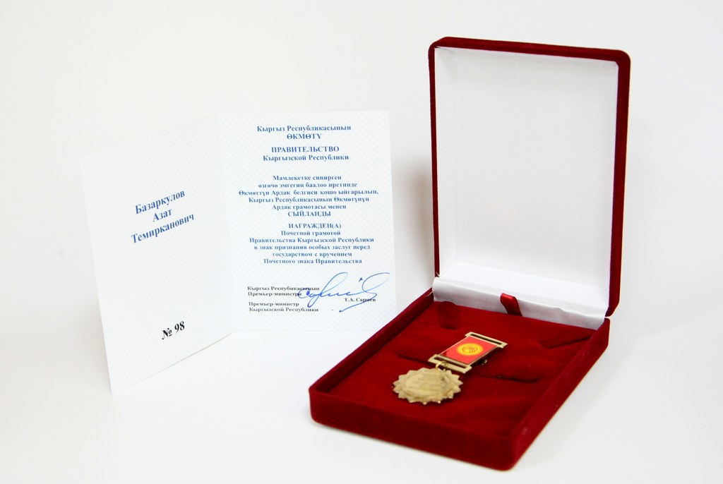 - Нагрудный знак от Фонда по управлению государственным имуществом при Правительстве КР «Отличник системы управления государственной собственностью» – 2015 год;
