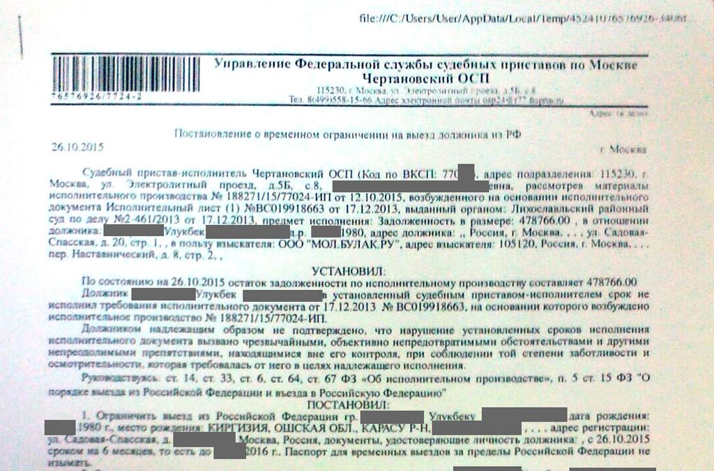 - Надоело, решил вернуться на родину. В Шереметьево меня сняли с рейса, запретили выезд, пока полностью не выплачу долг. Приставы вручили постановление о возбуждении исполнительного производства и еще постановление о временном ограничении на выезд из РФ. Вообще у меня такая ситуация сейчас: из России выехать не могу, пока долг не выплачу. А потом, если уеду, не смогу заехать, потому что попал в черный список ФМС. Я и в Кыргызстане в розыске. Прямо история для криминального сериала!