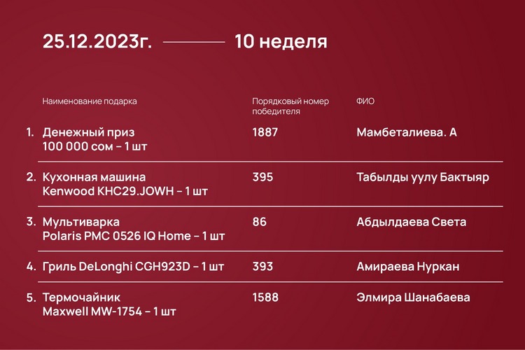 Розыгрыш проходил каждый понедельник с 23 октября 2023 года до 15 января 2024-го при помощи генератора рандомных чисел https://randomus.ru/.
