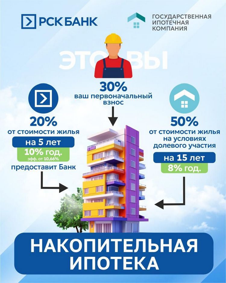 «РСК Банк» совместно с Государственной ипотечной компанией по инициативе президента страны разрабатывает уникальный социальный проект «Накопительная ипотека». В рамках него подписан договор о сотрудничестве первыми лицами государственных компаний.