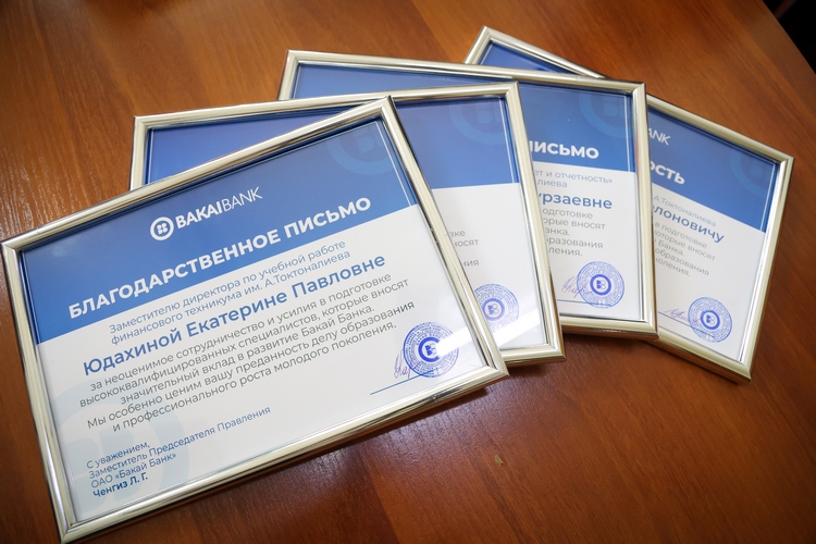 «Бакай Банк» выразил признательность преподавателям БФЭТ за их вклад в подготовку будущих финансовых специалистов, вручив им благодарственные письма. Уже несколько лет подряд банк и техникум успешно сотрудничают в области подготовки и сертификации квалифицированных кадров.