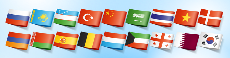 Россия, Казахстан, Узбекистан, Турция, Китай, Грузия, Беларусь, Армения, Таиланд, Вьетнам, Саудовская Аравия, Кувейт, Катар, Испания, Бельгия, Дания, Люксембург, Южная Корея.