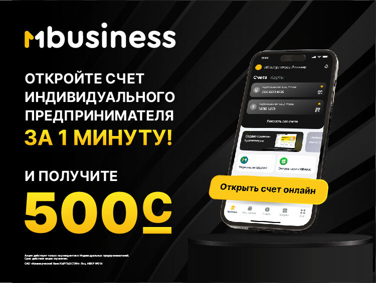 ОАО «Коммерческий банк Кыргызстан» | MBANK объявляет о запуске новой акции для индивидуальных предпринимателей в рамках приложения MBusiness. Теперь открытие счета онлайн станет не только удобным, но и выгодным! Каждому новому клиенту, открывшему счет через онлайн-платформу, MBANK дарит 500 сомов.
