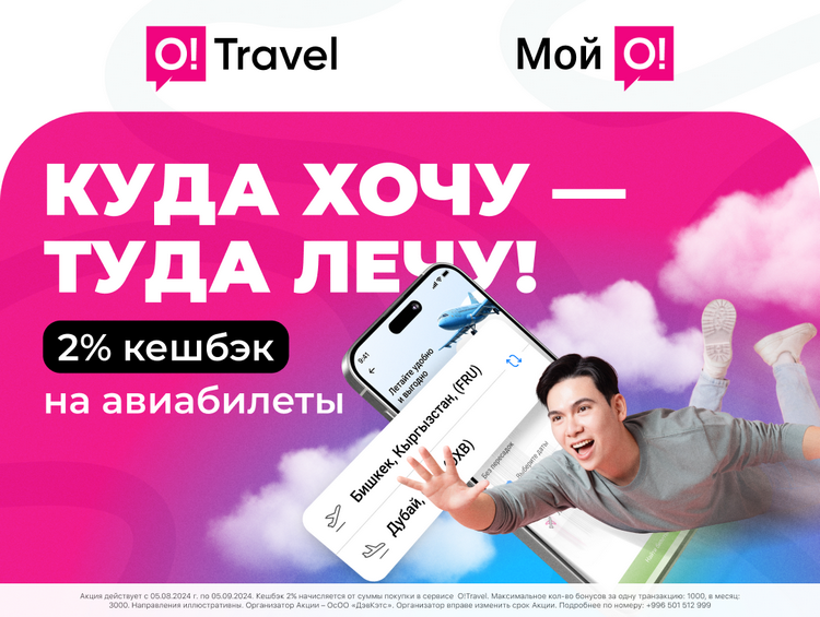 *Акция действует с 05.08.2024 г. по 05.09.2024. Кешбэк 2 процента начисляется от суммы покупки в сервисе O!Travel. Максимальное кол-во бонусов за одну транзакцию: 1000, в месяц: 3000. Организатор акции — ОсОО «ДэвКэтс». Подробнее по номеру: +996 501 512 999.