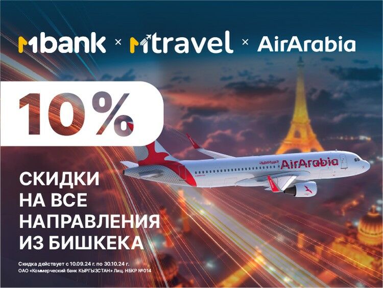 Благодаря акции на перелеты пользователи сервиса MTravel (в приложении MBANK) с 10 сентября по 30 октября этого года могут приобрести авиабилеты с выгодной скидкой 10 процентов на все направления авиакомпании при условии вылета из Бишкека.