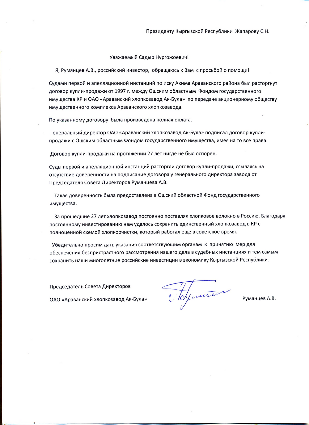 В своем обращении он пишет, что суды первой и апелляционной инстанций по иску акима Араванского района расторгли договор купли-продажи от 1997-го между Ошским областным Фондом государственного имущества КР и ОАО «Араванский хлопкозавод «Ак-Була» по передаче акционерному обществу имущественного комплекса Араванского хлопкозавода.