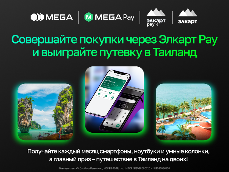 MegaPay и «Элкарт» напоминают, что с 16 декабря 2024 года по 16 марта 2025-го у всех пользователей виртуальной карты «MEGA ЭЛКАРТ» есть уникальная возможность принять участие в грандиозной акции. Главный приз — путешествие в Таиланд на двоих, а также множество других ценных наград!