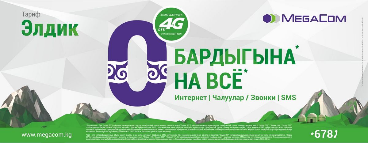 Пакет «Элдик 210» включает в себя все, что нужно для общения по различным каналам связи. В неделю вы получите 7350 мегабайт Интернета (более 1 гигабайта в день на максимальной скорости), 1500 минут в сети + 50 минут на другие сети по Кыргызстану, 2500 SMS в сети без суточных ограничений.