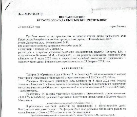 По его утверждению, кроме этого, все три судебные инстанции исключили Ахмеда Билала и Махмуда Билалова из состава участников ОсОО «ТАНСУ», установив факты нанесения ими существенного вреда ОсОО «ТАНСУ» и самому Закерья Тахирову.