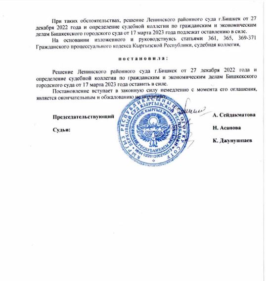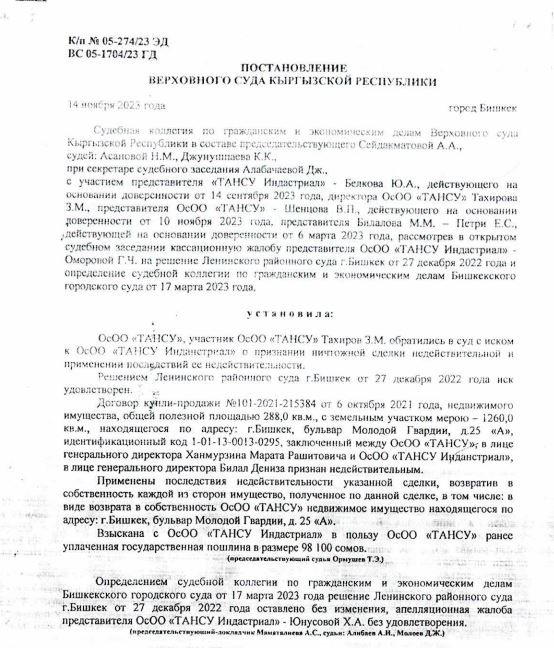 Он рассказал, что все три судебные инстанции признали его увольнение из компании незаконным. Затем все три судебные инстанции признали незаконной и недействительной сделку по продаже в собственность ОсОО «Тансу Индастриал» торгового центра ОсОО «ТАНСУ».