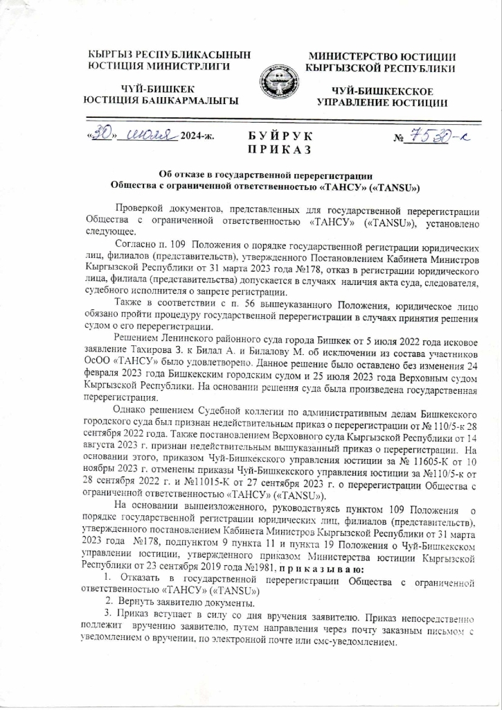 Сначала Чуй-Бишкекское управление юстиции, куда обратился предприниматель после получения решения суда, дважды провело перерегистрацию ОсОО, исключив из списка братьев Билаловых, и дважды отменило свое же решение. После череды разбирательств Закерья Тахиров в третий раз обратился в Чуй-Бишкекское управление юстиции с требованием исполнить решение суда и исключить Билаловых и Марата Ханмурзина из базы Минюста. Но 30 июля 2024 года получил приказ об отказе в проведении государственной перерегистрации в связи с тем, что ранее были отменены два предыдущих приказа от 28 сентября 2022 года и от 27 сентября 2023 года.