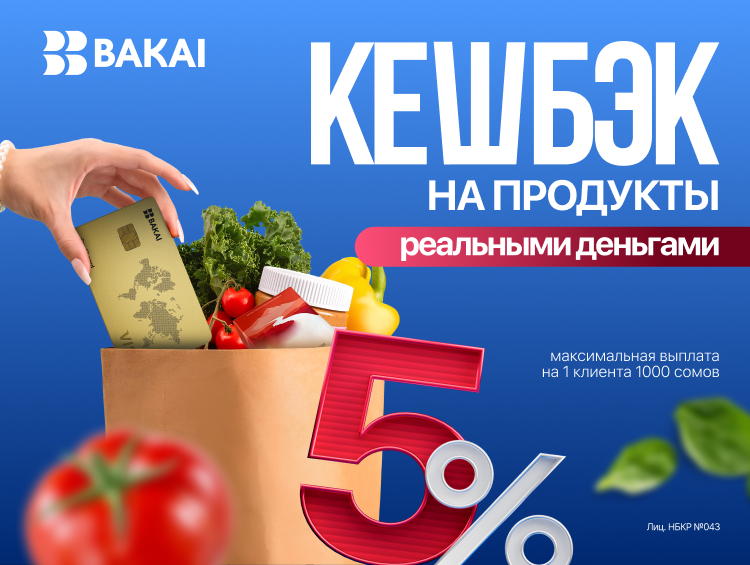 Повышенный кешбэк начисляется автоматически при оплате картами Visa от BAKAI. Максимальная сумма выплаты составляет 1 тысячу сомов на одного клиента за весь период.