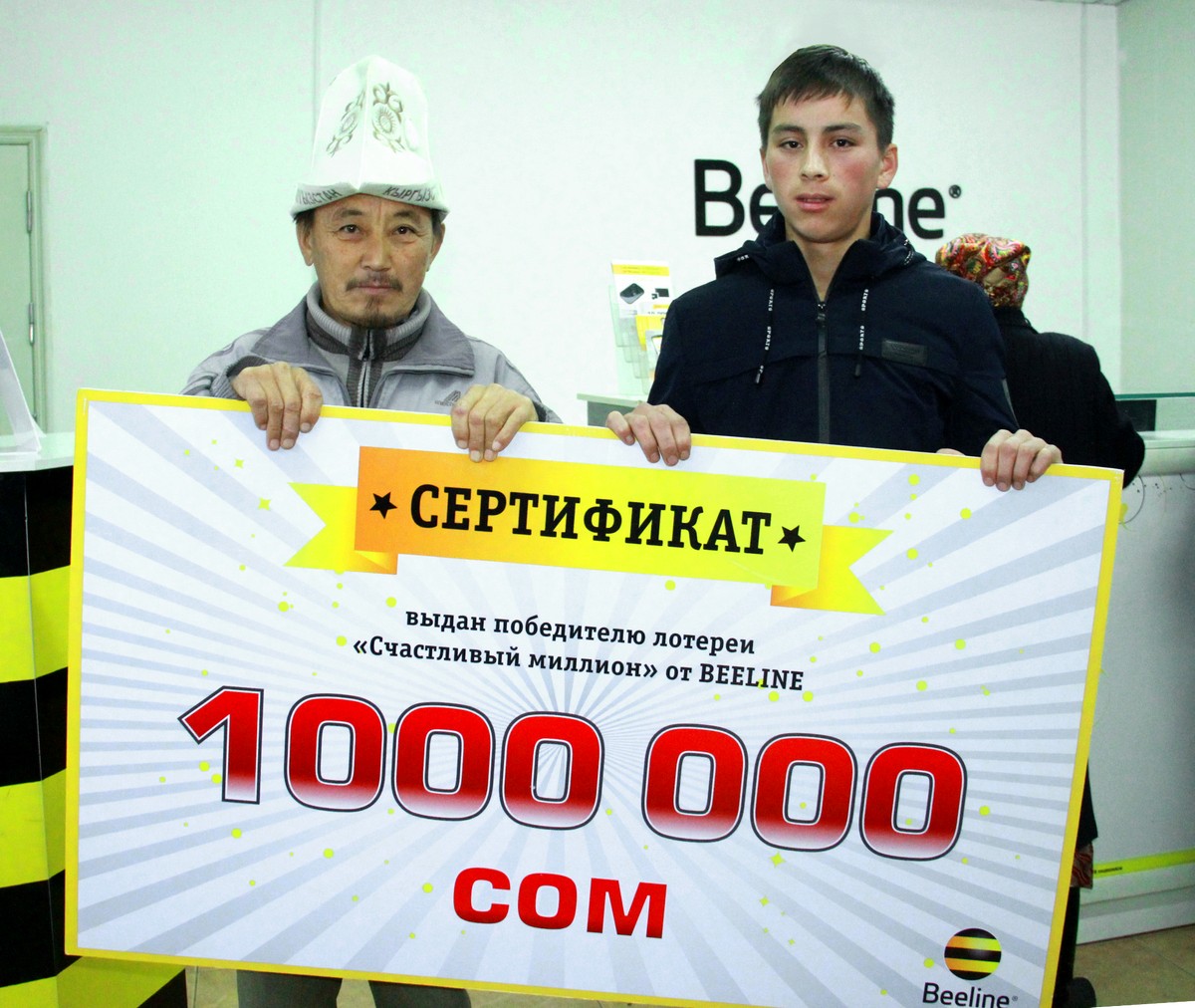 Торжественная церемония вручения сертификата на миллион сомов прошла в Баткенском региональном отделении Beeline. Обладателем главного приза лотереи оказался житель г. Кадамджая Мамыт Маданов.