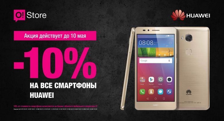 С 6 апреля при покупке мобильного устройства производства компании Huawei в любом из сети магазинов O!Store клиент получает бонус в виде скидки в 10 процентов от розничной стоимости устройства.
