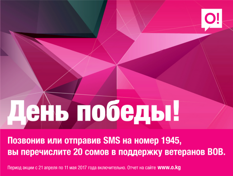 Мобильный оператор О! объявляет о начале ежегодной акции «День Победы». Каждый абонент сети О! может помочь ветеранам Великой Отечественной войны путем отправки SMS или звонка на номер 1945. Стоимость каждого такого SMS-сообщения или звонка — 20 сомов. Период акции — с 21 апреля по 11 мая 2017 года.