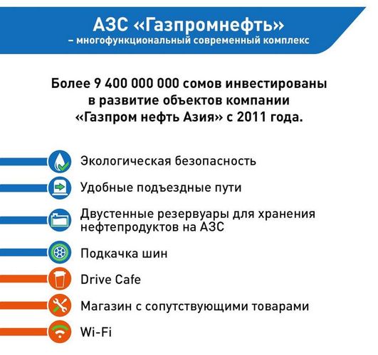 Компания «Газпром нефть Азия» никогда не экономила на капитальных вложениях, что позволило за 6 лет превратить все АЗС сети «Газпромнефть» в современные многофункциональные комплексы. Инфраструктура АЗС соответствует самым жестким требованиям промышленной и экологической безопасности: все — начиная от подъездных путей и заканчивая резервуарами для хранения топлива — выстроено так, чтобы предупредить саму возможность чрезвычайных ситуаций. Резервуары двустенные, трубопровод изолирован так, чтобы ни одна капля горючего не попала в почву. Любая деталь в работе АЗС продумана до мелочей, а сотрудники регулярно участвуют в учениях по технике безопасности и экстренному реагированию.