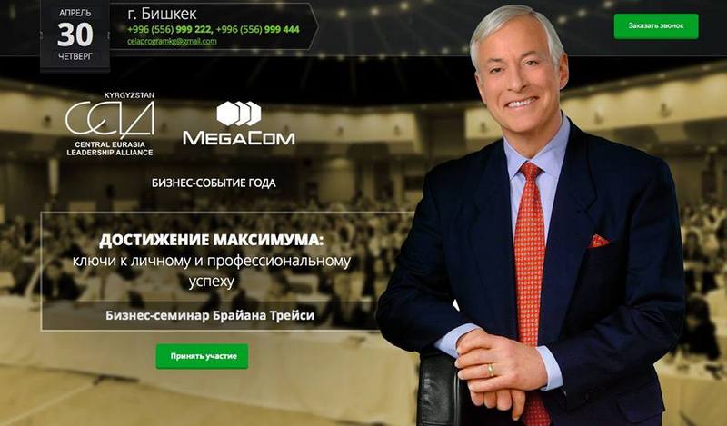 Кыргызстан посетит Брайан Трейси, один из лучших ораторов, бизнес-тренеров в мире. Единственный семинар гуру в области продаж, менеджмента, развития личности, бизнеса в Бишкеке «Достижение максимума: ключи к личному и профессиональному успеху» состоится 30 апреля 2015 года при поддержке генерального партнера события – компании MegaCom.