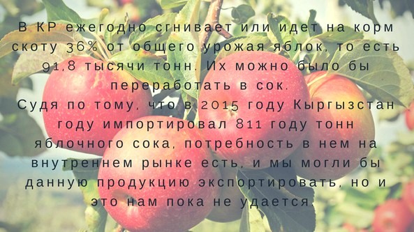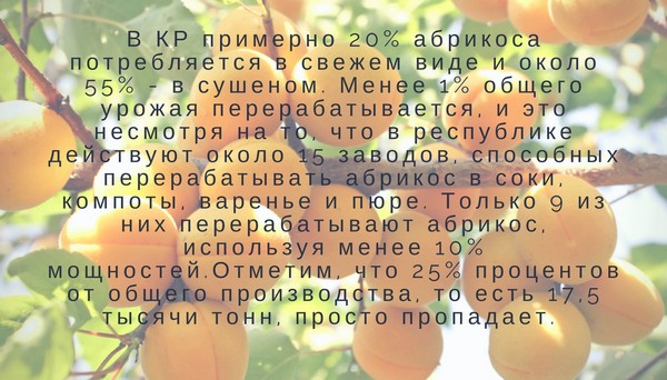Весь этот урожай мог быть переработан и принести прибыль производителям. Кыргызстан экспортирует в Таджикистан 90 процентов от общего экспорта свежего абрикоса. Там его перерабатывают и отправляют в Россию. Сегодня наш сосед является одним из крупнейших поставщиков абрикоса в РФ и другие страны. Почему мы не может занять эту нишу?! Ясно одно: мы не можем достойно подготовить продукт и предложить его.
