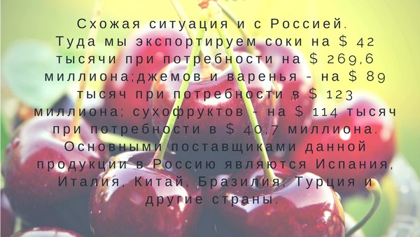 Соки поставляют Казахстан, Россия, Узбекистан, Израиль, Китай, Украина, Бразилия. Поставщиками же варенья и джемов являются Россия, Китай и Чили.