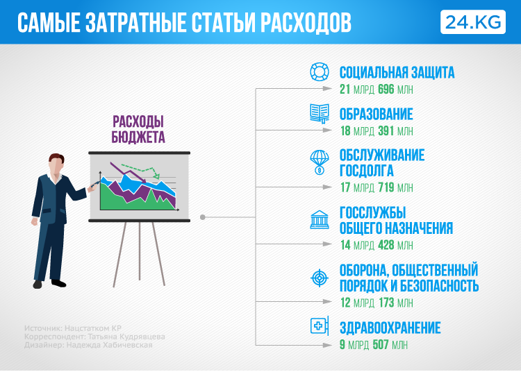 Традиционно самые большие расходы приходятся на социальную защиту, образование и государственные службы общего назначения. Меньше всего денег выделили на охрану окружающей среды — 527,1 миллиона сомов.