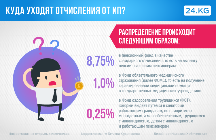 Индивидуальные предприниматели (ИП), уплачивающие налоги на основе общего налогового режима путем приобретения обязательного патента, платят ежемесячно 10 процентов от размера среднемесячной зарплаты в Кыргызстане. На этот год она составляет 15 тысяч 670 сомов. То есть, кроме суммы патента, ИП должен перечислить 1 тысячу 567 сомов в Соцфонд.