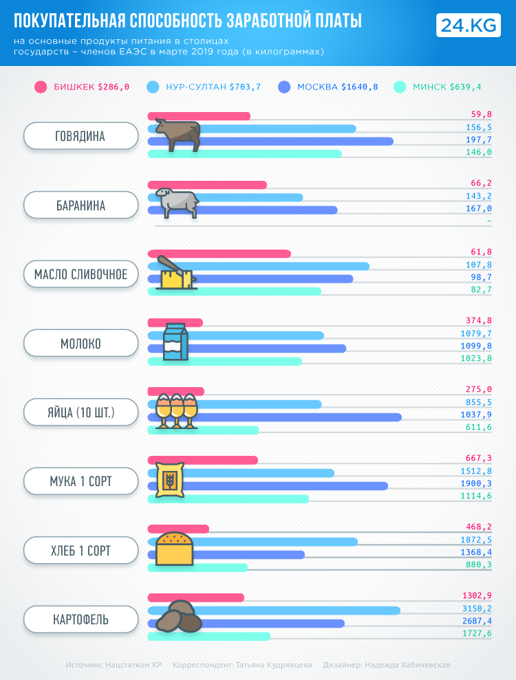 «Сравнительный анализ покупательной способности среднемесячной заработной платы по столицам отдельных стран ЕАЭС показывает, что в марте 2019-го ее показатели по всем продуктам питания в Бишкеке отставали от их уровней в остальных городах. Это связано с низким размером средней заработной платы в Бишкеке», — отметили в Нацстаткоме.
