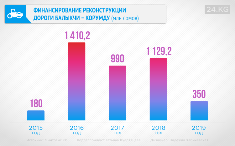 «Предусмотренные на 2019 год 350 миллионов сомов уже выделили из республиканского бюджета. На участке от нулевого по 7-й километр начали установку железобетонных труб, расширение дороги на железнодорожных переездах и других искусственных сооружениях. После планируется уложить асфальтобетонное покрытие. Местами уложен нижний слой асфальтобетонного покрытия протяженностью 2 километра», — рассказали в Минтрансе.