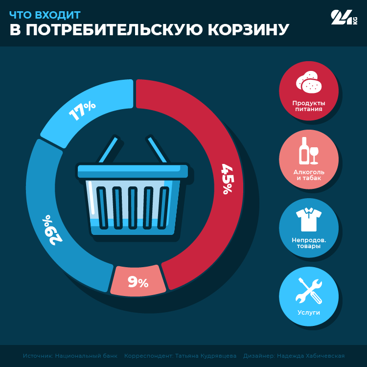 Набор конкретных товаров и услуг в потребительской корзине определяется путем опроса населения в разных частях страны — от Бишкека до отдаленных сел. Это делают, чтобы понять, сколько и какие товары и услуги использует население. Например, кто-то не ест мясо и не ездит на машине. Кто-то, наоборот, без мяса жить не может и авто меняет каждый год.