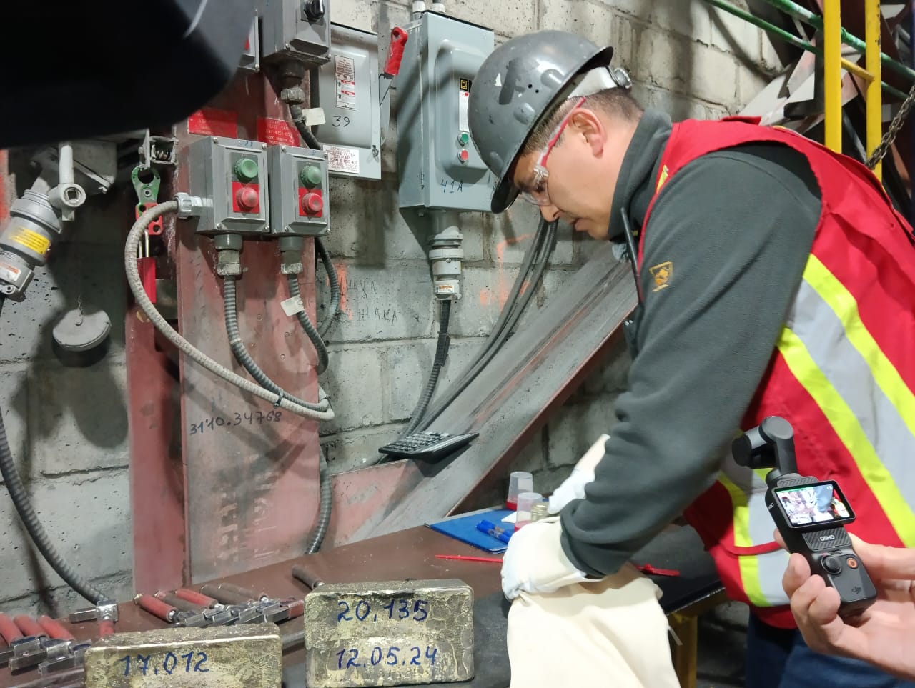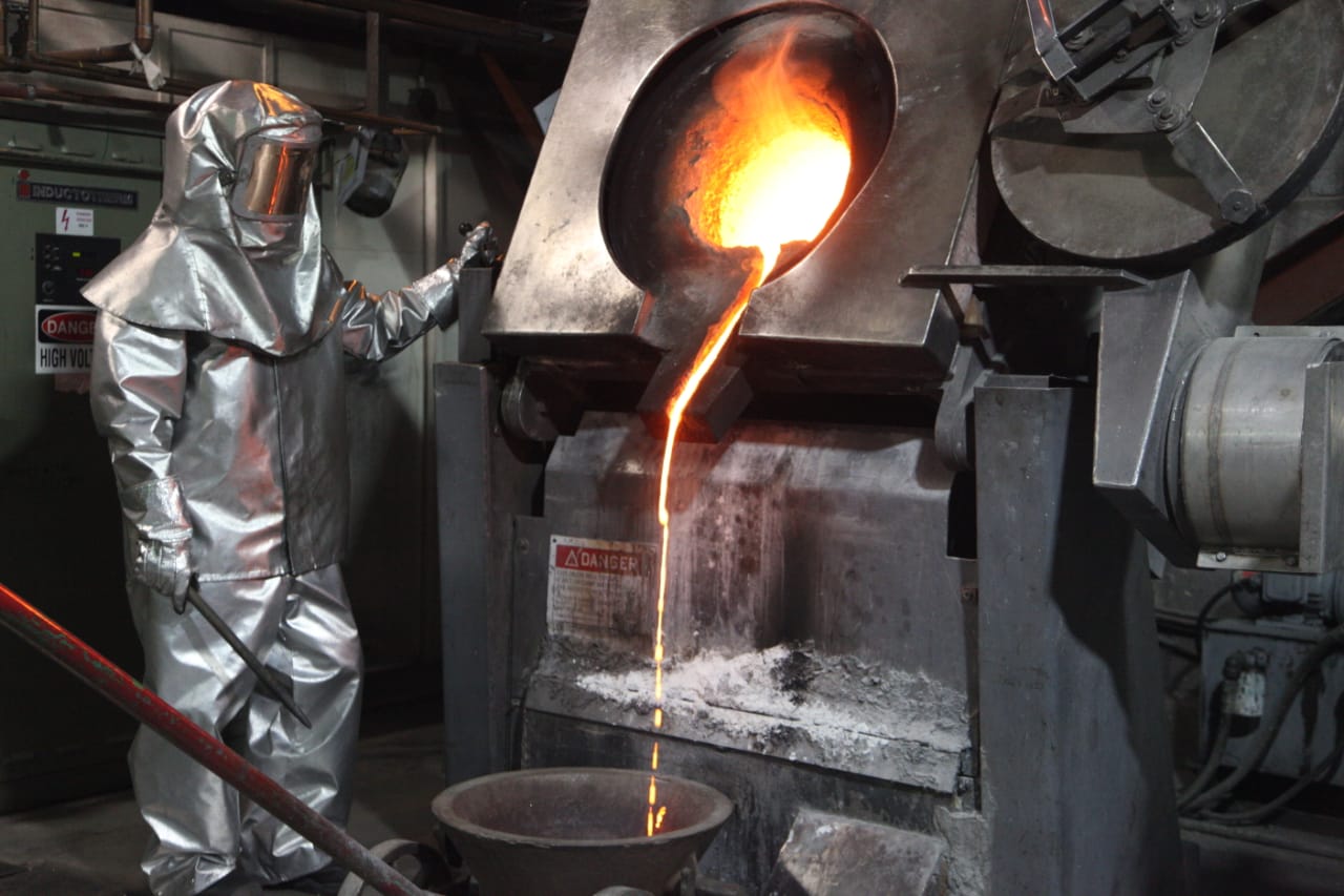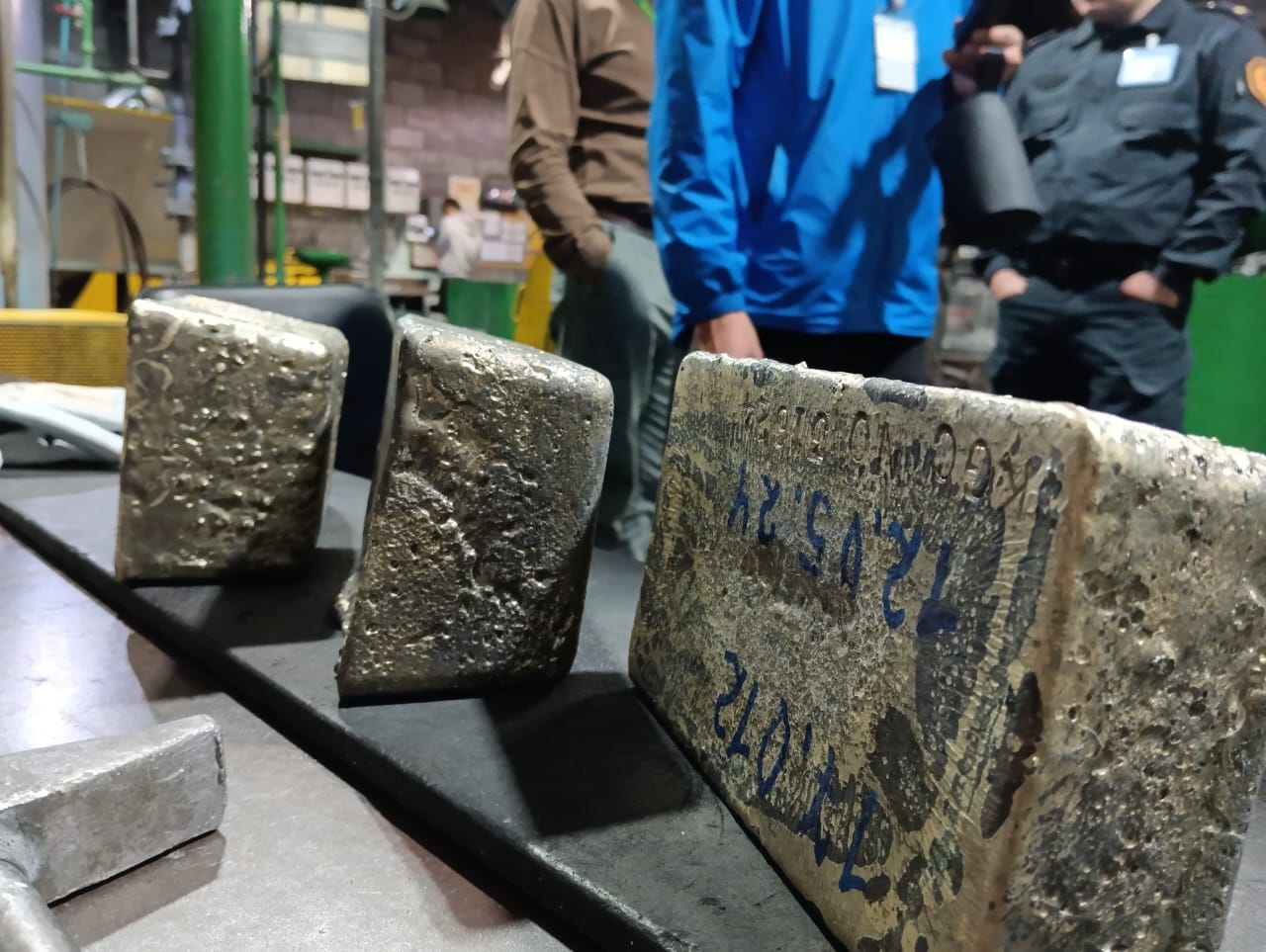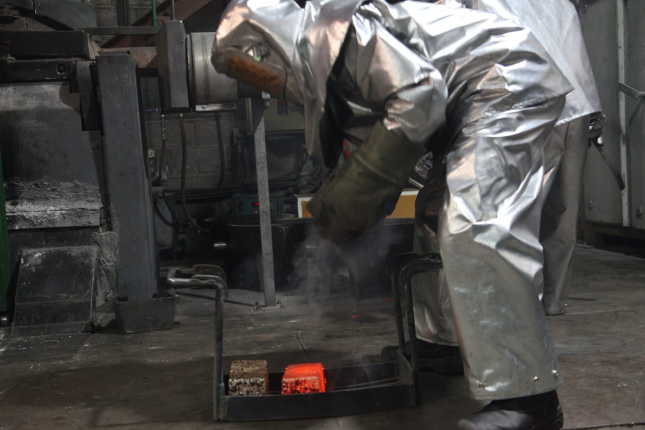 «После приемки с представителями месторождения взвешивается каждый слиток доре. Потом переходим в следующую комнату, где плавим весь этот состав в двух индукционных печах. Там и берется проба в специальные колбы. Всего берется четыре пробы: одна колба идет поставщику, одна — в лабораторию, и две колбы остаются у нас. Все это опять-таки в присутствии представителей месторождения. Далее расплавленный состав разливается в специальные формы слитков», — сказал начальник цеха.