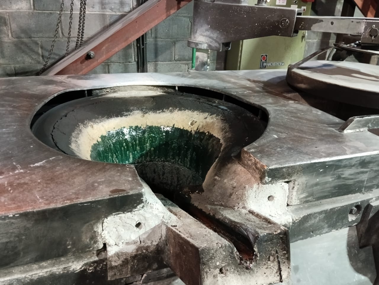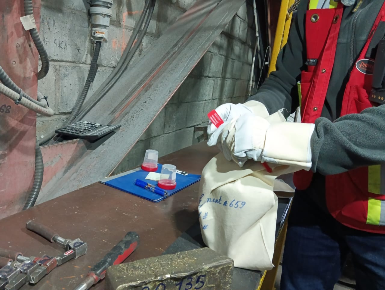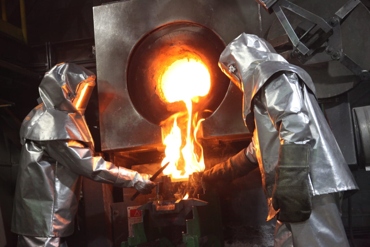 «После приемки с представителями месторождения взвешивается каждый слиток доре. Потом переходим в следующую комнату, где плавим весь этот состав в двух индукционных печах. Там и берется проба в специальные колбы. Всего берется четыре пробы: одна колба идет поставщику, одна — в лабораторию, и две колбы остаются у нас. Все это опять-таки в присутствии представителей месторождения. Далее расплавленный состав разливается в специальные формы слитков», — сказал начальник цеха.