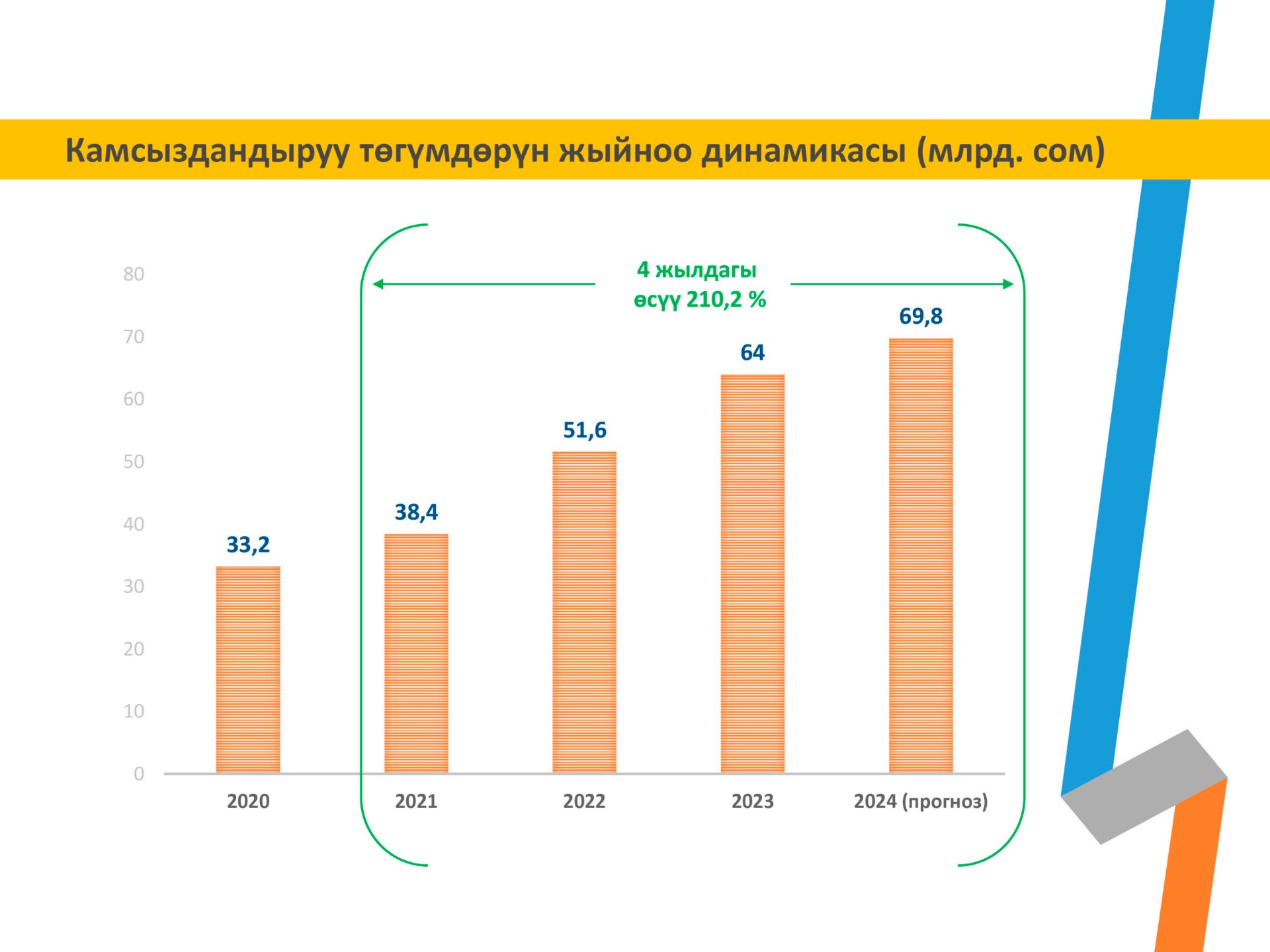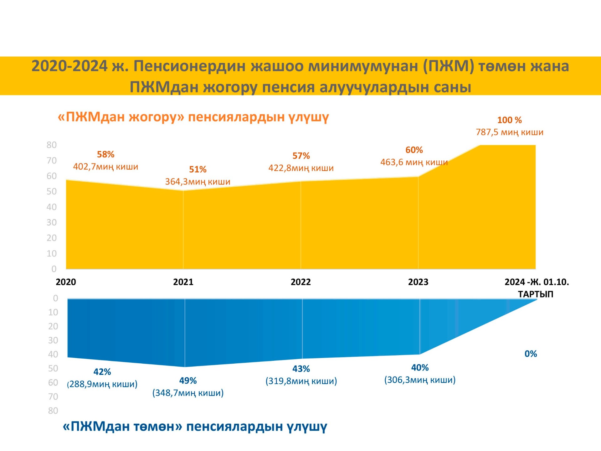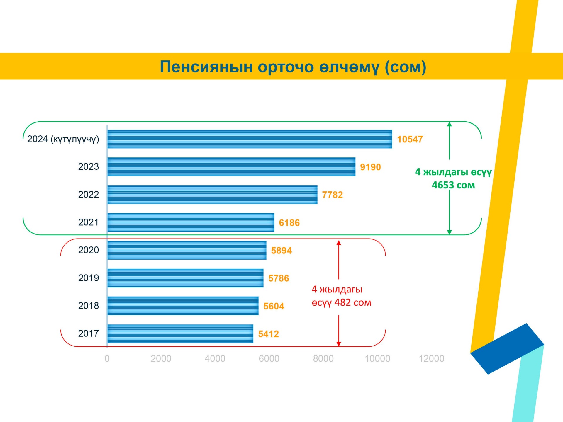 В 2022 году пенсии увеличены на 33 процента. Для этого потребовалось 20 миллиардов сомов. За счет средств пенсионного фонда увеличилась страховая часть пенсий до 30 тысяч сомов (на 38 процентов). Для этого повышения из пенсионного фонда дополнительно выделено еще 20 миллиардов.